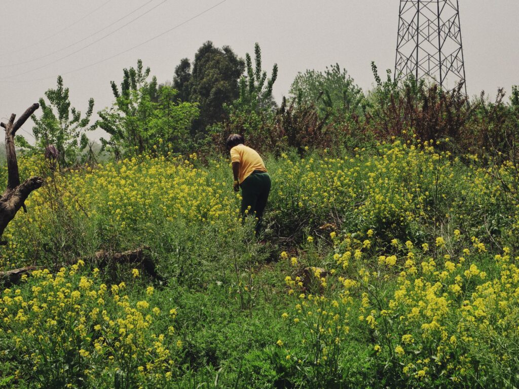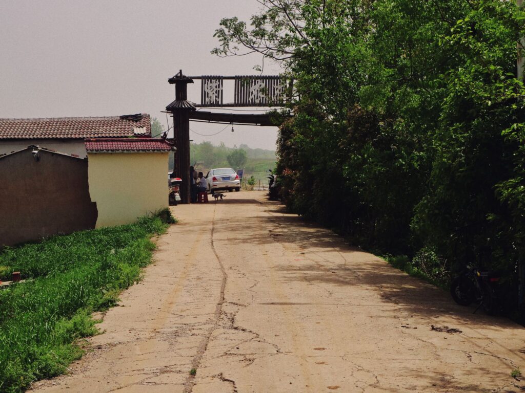 绕了一圈离开了农庄,回到大桥上继续向南走。拐进一个岔路后是一片农田,远处还有一连个农妇在摘草。