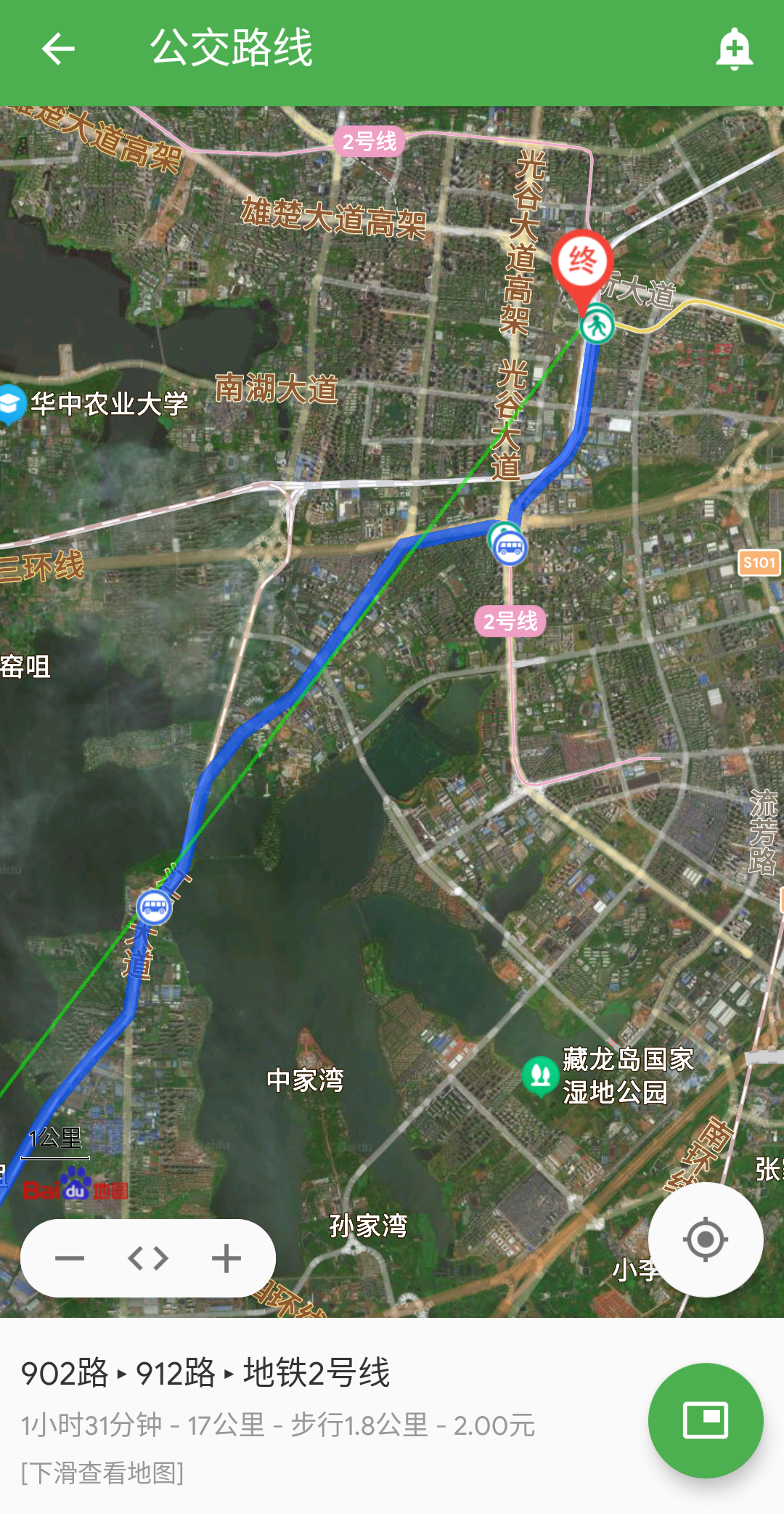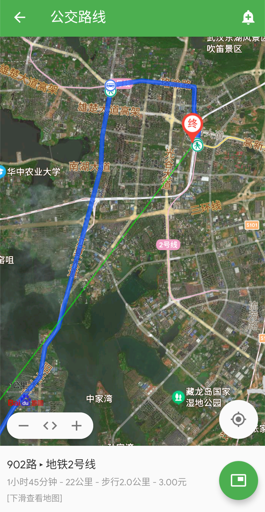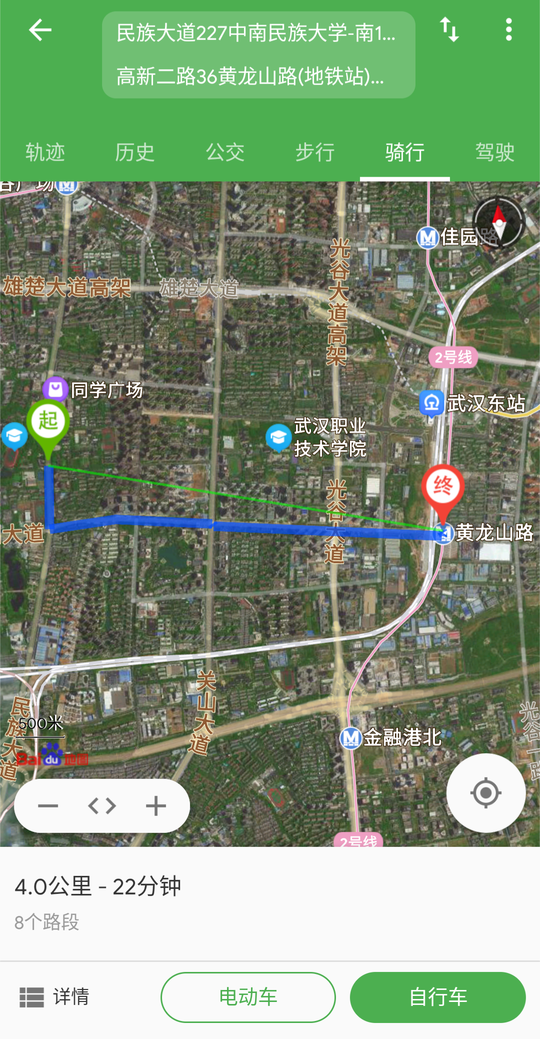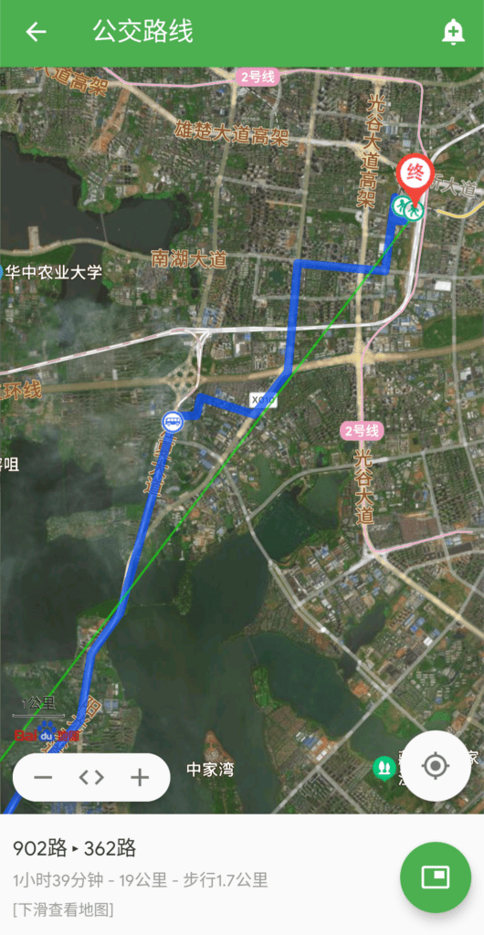 大概的线路是先坐902北行线再转车或选择其他方式到武汉东站坐11号线。因为902沿民族大道往光谷广场方向开,而武汉东站在光谷大道东边,所以换乘是少不了的。但考虑到周六上午部分路段可能会很堵,而且除了912其他到武汉东站的车都在西广场停靠,而地铁口全在东广场,就算有直达的地下通道还是要花上些时间,更何况换乘等车的时间更不确定。看了地图最终还是决定到中南民族附近下车,然后骑车沿南湖大道一路前往黄龙山站(下一站就是武汉东站),这段耗时大概13分钟。