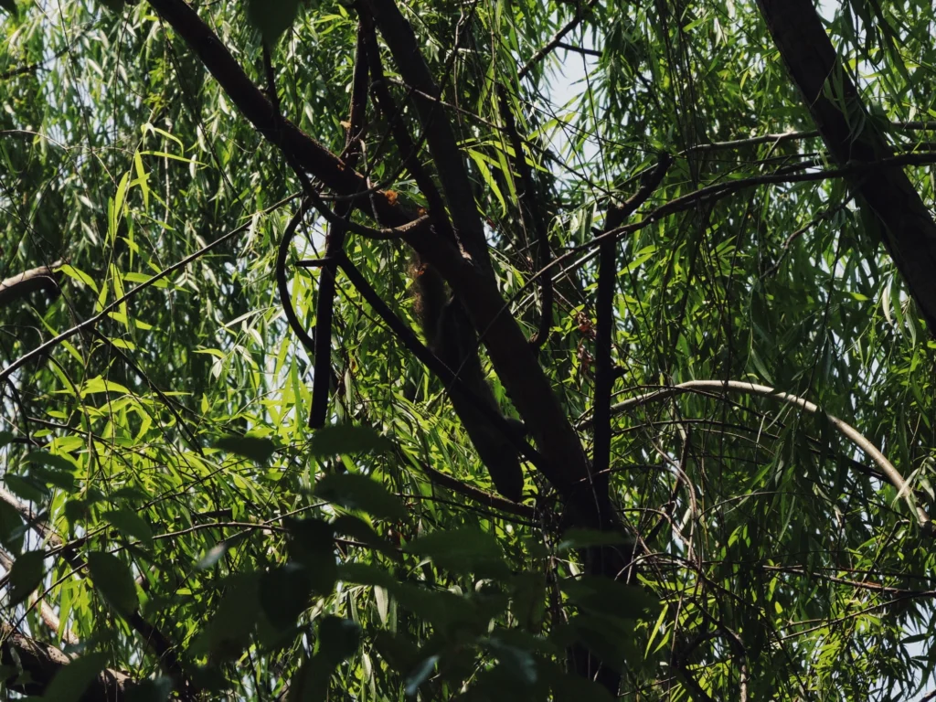 路上遇到一只松鼠,见我靠近便敏捷地窜向路旁的柳树上,说实话在远处我还以为这是只斑鸠之类的鸟。它在枝叶中像是忍者一样飞跃,稍不注意就很容易跟丢。