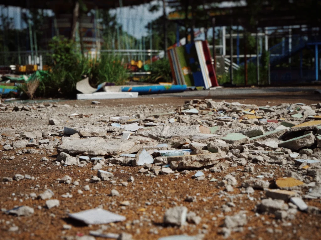 各种设施的部件七零八落,随处可见水泥块和碎玻璃。很难想象曾经热闹非凡的地方如今破败荒凉。“人死了会有葬礼,但土地和城市死去却什么都没有”。
