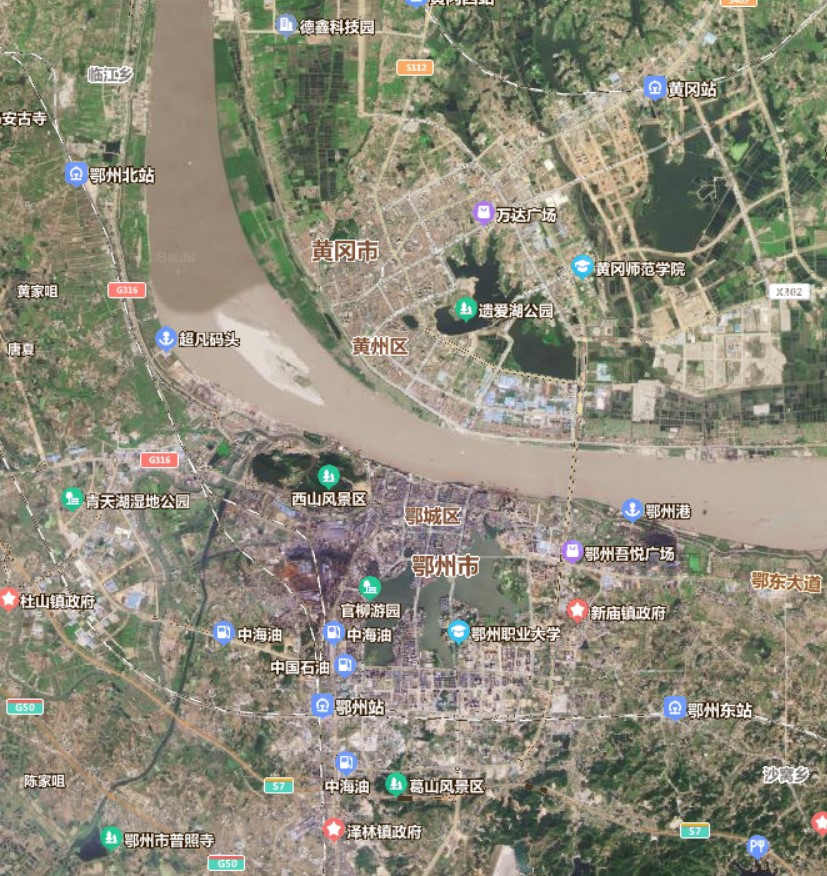 鄂州和黄冈的主城区,只隔了一座约1100米的长江大桥。长江在这里有一个直角拐弯,东北岸是黄冈,西南岸是鄂州,通过鄂黄长江大桥相连。