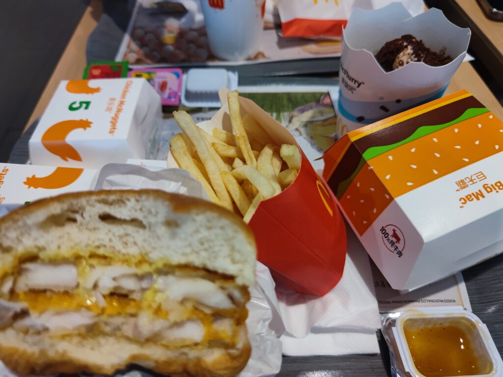 我们两个人背着大包小包走街串巷,定了个电竞酒店打算下午休息一下晚上住也方便。导航到酒店了,在马路对面,本着要做高质量大学生的想法不能横穿马路,走了起码2公里累够呛。过了马路后想先找家饭店随便吃点,可是来来去去就那么几家店,饭店还没有建筑材料店多,又跑到旁边的电子设备城吃的M记。