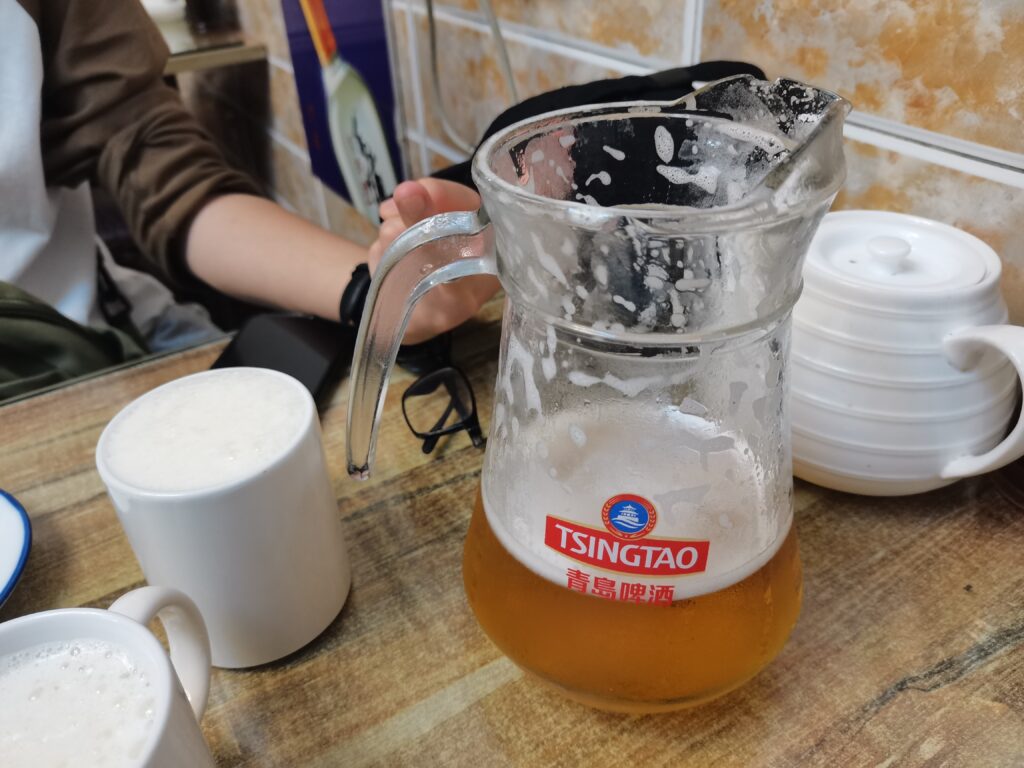三人实在太饿,又找了一个饭馆,饭馆实在隐蔽,又在小区里,是青岛本地人开的,味道真心不错。海鲜饺子很鲜美。喝到了青岛啤酒,没有那么苦, 还挺好喝的。