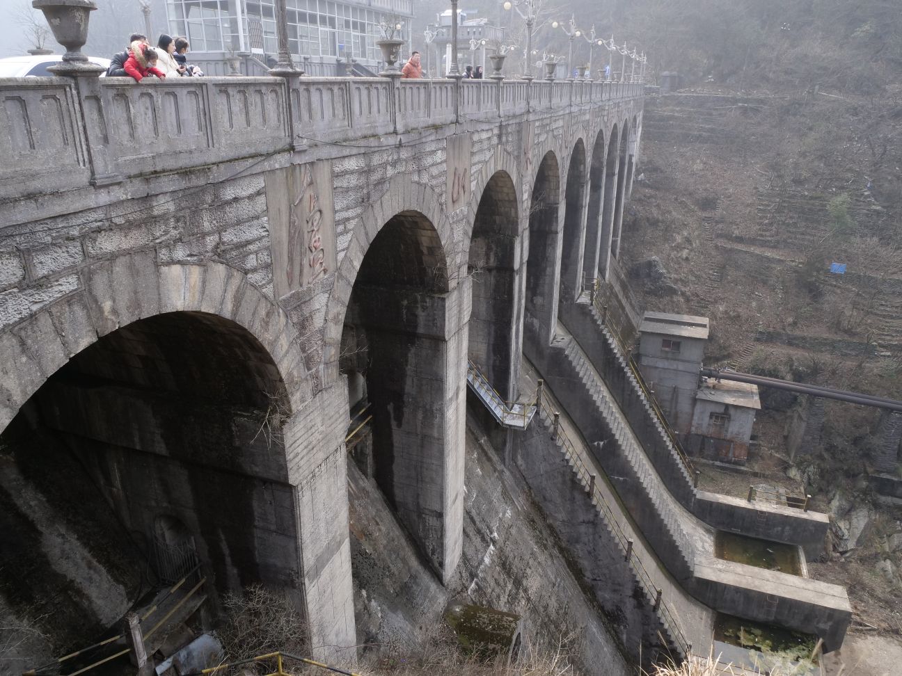 坐车前往电站大坝。这个大坝没水,我差点以为是废掉的。头顶有缆车经过。因为这个地方离五老峰比较远,走过去太费时间了,于是又坐西线的车原路返回并前往五老峰山脚下,放弃午饭了。