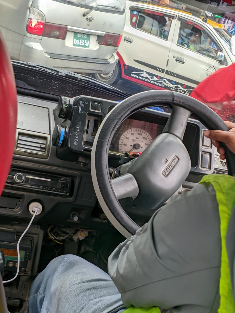 昨天晚上问笔友,本地人都是怎么出行的。她说了一个叫Pathao的APP,可以在上面打车和叫摩的,和滴滴差不多。然后我叫了一辆车到市里的宾馆,刚打开门就被车子“豪华”的内饰震惊到了,差点以为坐上了20年前的拖拉机。