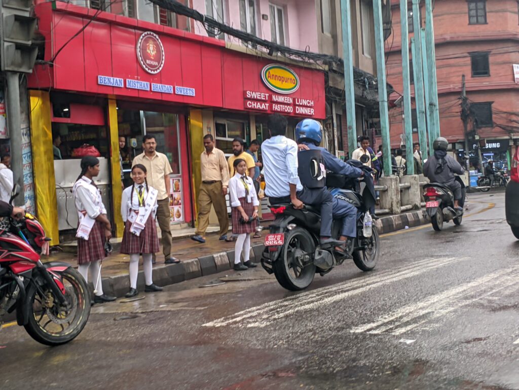 加德满都的街道上有很多摩托车,大多是营业性质的。很多机动车排放着黝黑的烟,路上充斥着刺鼻的尾气味道。