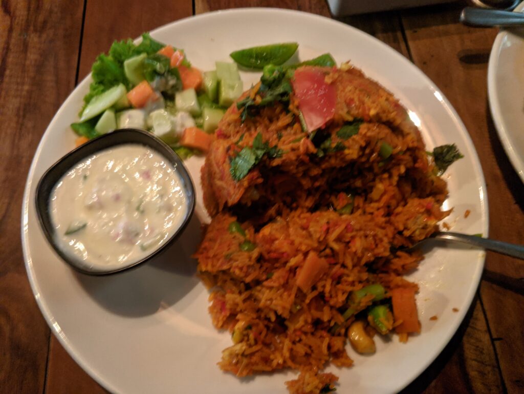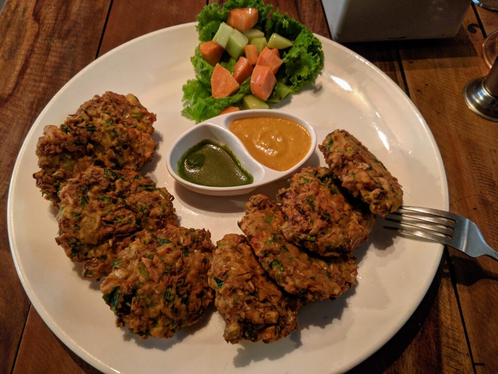 上菜之后直接傻眼了,量实在是太多,任选一个都能吃饱。这个pakoda本身比较清淡,外表炸的比较脆,里面应该是各种蔬菜的混合;附带的辣酱比较凉,要是热些就好了,本身是咸辣口的。炒饭(不确定是不是,和当地的米饭配鸡肉蔬菜咖喱有点像,但混在了一起)有点太腻了,忘记具体点的是哪一道菜,不过也可能是pakoda吃太多了导致没有什么食欲评价炒饭。苏打水就像是把糖换成盐的雪碧,而且气很多,不是很好喝。