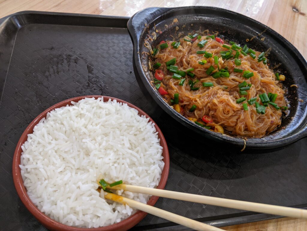 坐了2路回到市政府附近。随便找了个馆子点了一份蟹黄蒸粉。比较难吃,还很贵。