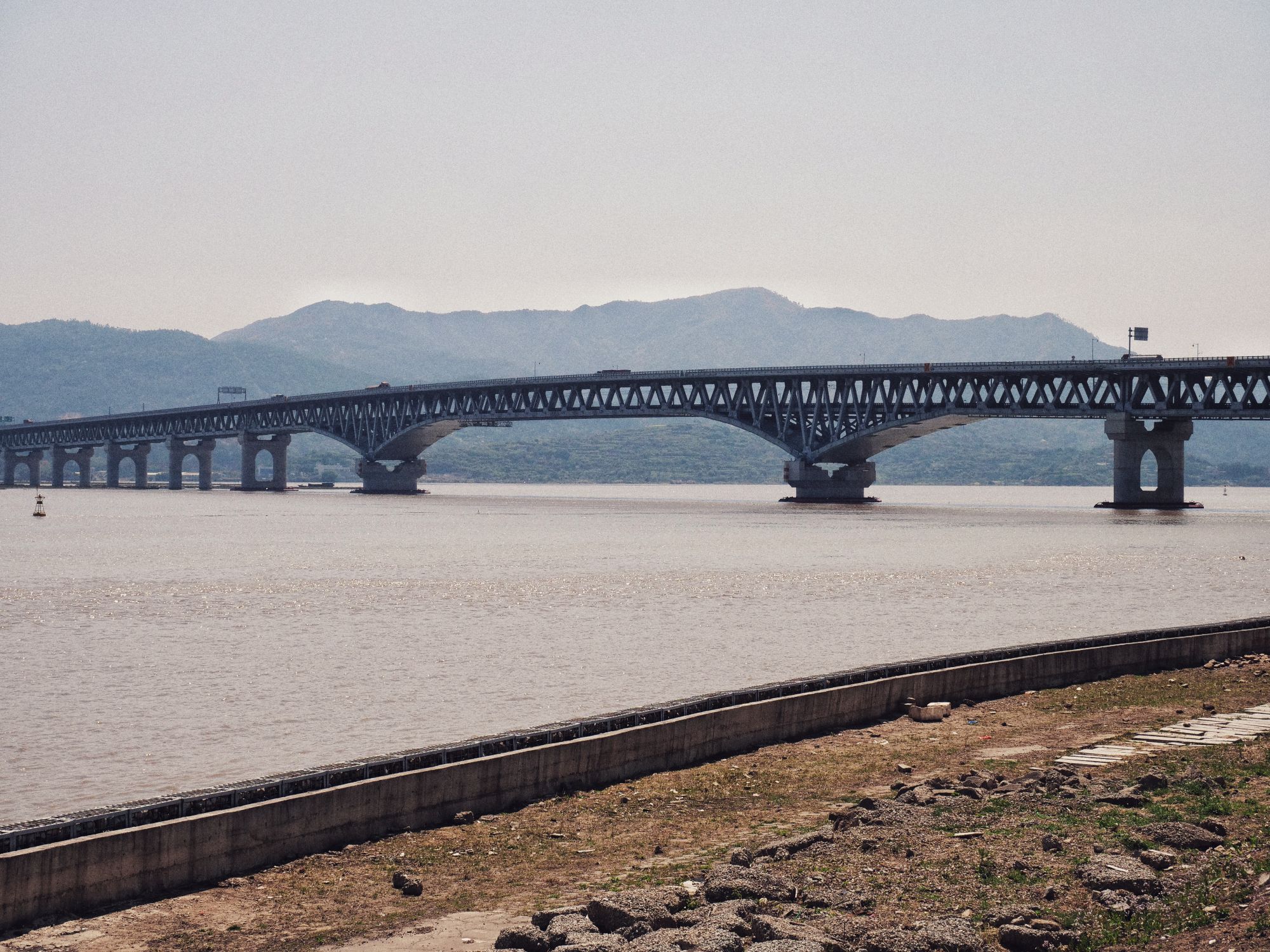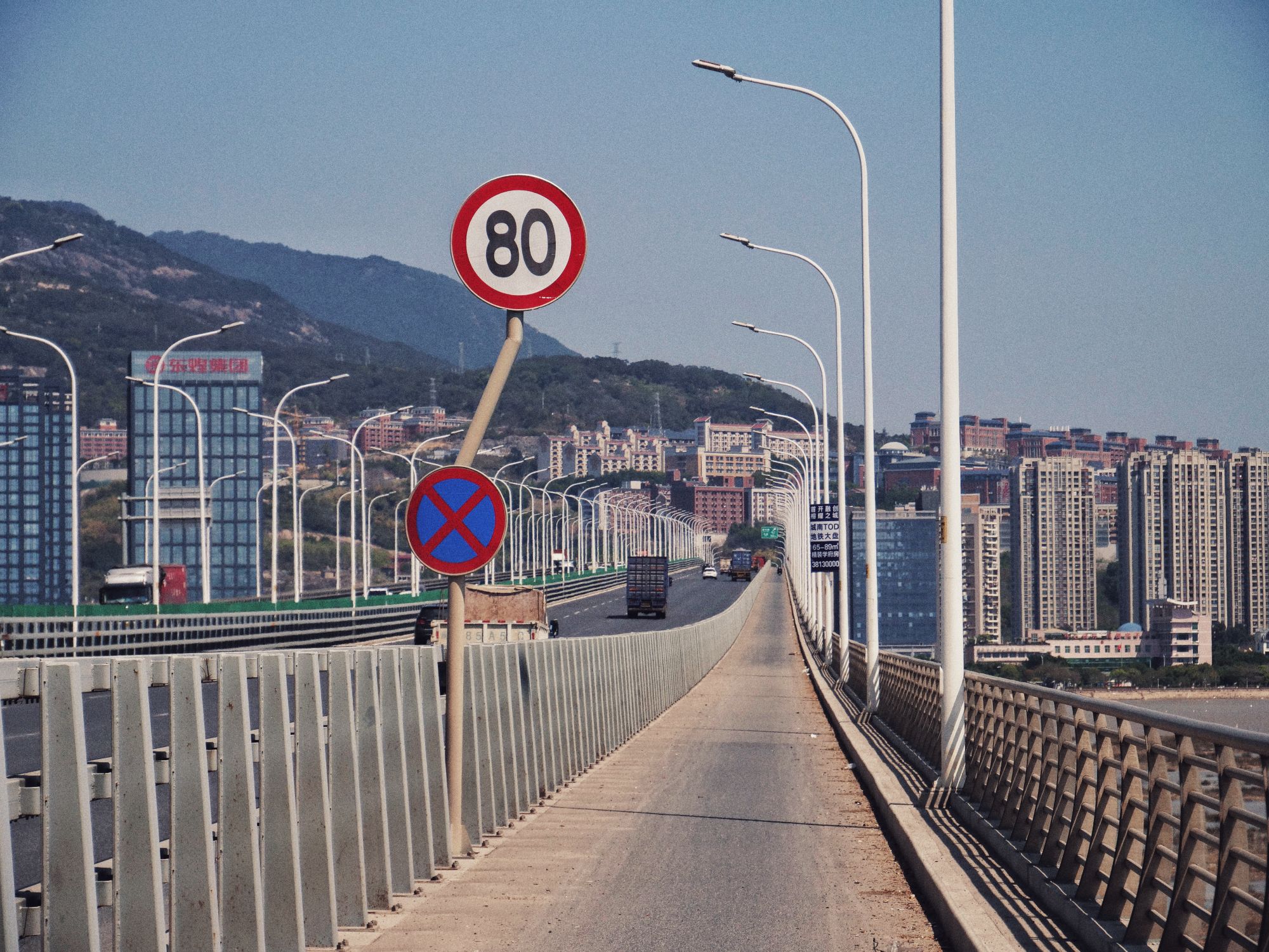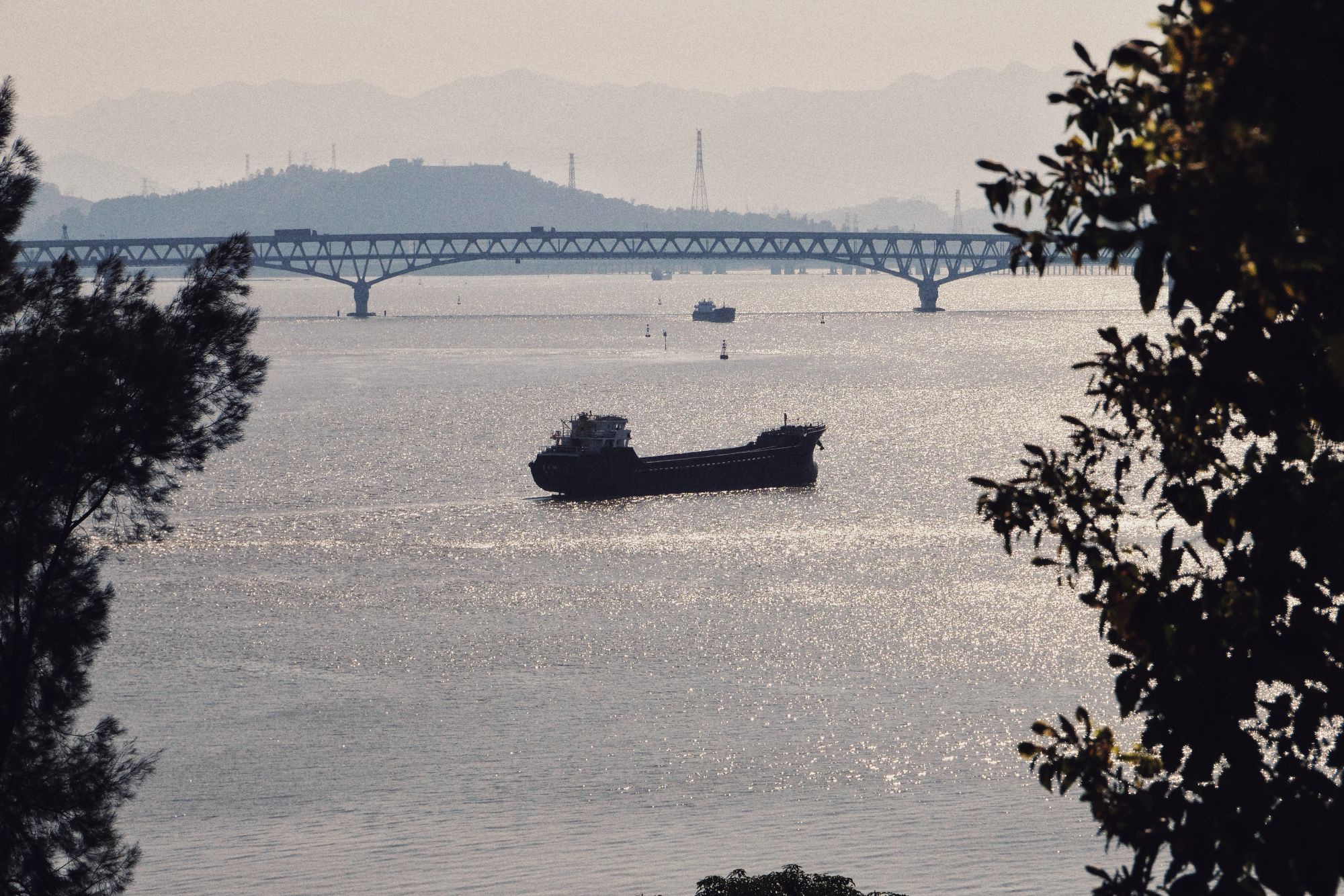 上桥。主桥全长1600多米,一路走走停停花了半个小时。桥体中间高两边低,双向四车道。之前是没有想到这桥还有非机动车和人行道,而且上午经过的电动车只有寥寥几辆,行人除了我没看到别的。