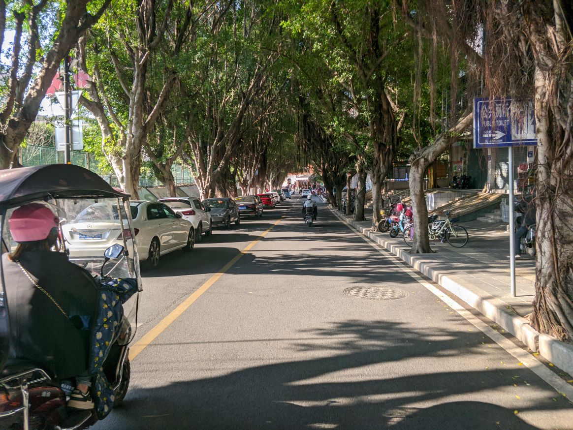 后来又骑车返回。路上到了前面说的马尾旧镇的十字路口又拐进了一个巷子看看。这有一个靠着山的老社区,路上处处都在榕树的树荫下。往前走了一点才知道福马线穿过这里。此时附近的小学正好放学。