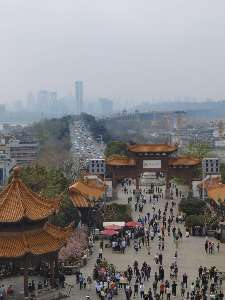 自黄鹤楼向西远眺,武汉长江大桥像是一座半岛向西延伸,连接着对岸的建筑群,给人一种强烈的压迫感。倘若将目光下移,则会看见对岸开阔的汉口江滩,那便是我下一站的目的地。