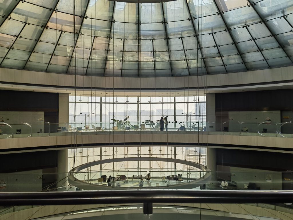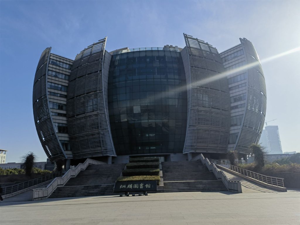 吃过午饭,E带着A和W从车库里的电梯溜进图书馆。独墅湖校区的图书馆叫炳麟图书馆,炳麟是其捐助者唐仲英之父的名字,外观形似水晶莲花,不过在三人眼中它更像是紫薇(注:①)。馆内不似想象中那样宽敞,但颇具设计感。乘坐直梯抵达图书馆顶层,可以俯瞰苏研院的概貌。