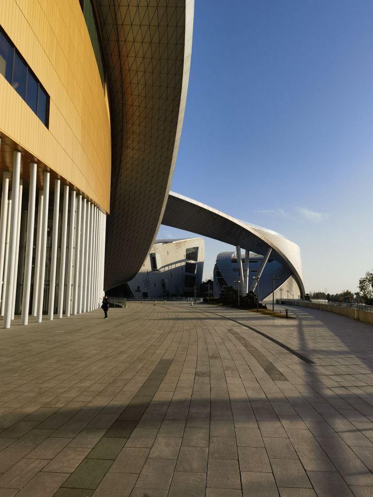 到达苏州湾大剧院时,太阳已经偏西,立柱的影子交错着落在剧院的玻璃上,时间在光影的罅隙间游走,将落日的辉煌书写在建筑的表面。