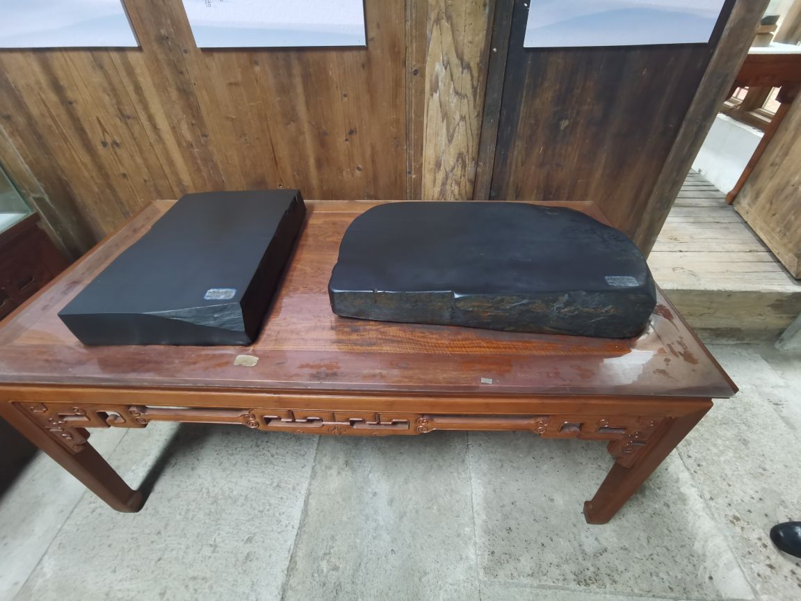 徽州府中歙县盛产砚台,出自歙县的砚台便被称为为歙砚。上河村内有一个小小的歙砚陈列馆,部分展品允许触摸。歙砚通体墨色,触感冰凉细滑,像是一块黑色的寒冰,冒着森森冷气。一块砚石不同部位的触感也不尽相同,有的部位像是软纱,略带些粗糙,有的部位则如同软缎,触之如流水般顺滑。